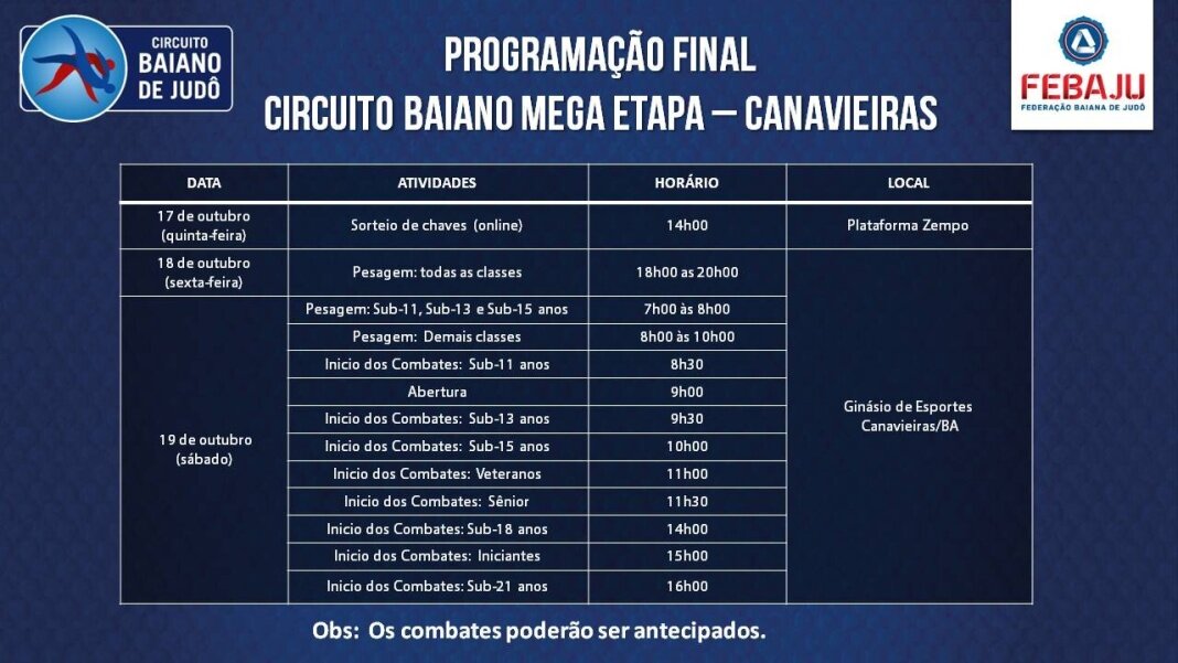 Fique atento (a) a programação da Mega Etapa do Circuito Baiano de Judô. Na sexta-feira (18), das 18h às 20h, ocorrerá a primeira pesagem de todas as classes no equipamento esportivo. Já no sábado (19), das 7h às 8h, ocorrerá a pesagem das classes Sub-11, Sub-13 e Sub-15. Logo depois, das 8h às 10h, das demais.