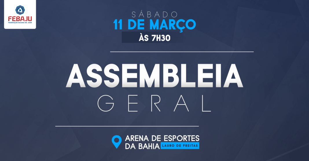 O Presidente da Federação Baiana de Judô, Marcelo Ornelas, no uso de suas atribuições estatutárias, convoca as filiadas, em dia com suas obrigações nos termos do Estatuto da entidade e do Regimento Eleitoral, para a realização da Assembleia Geral Ordinária, nos termos do art°. 33, caput e § 1º do Estatuto da entidade, que será realizada no dia 11 de março de 2023, às 7h30, em primeira convocação, podendo ser iniciada com maioria absoluta dos seus membros e, às 8h em segunda e última convocação, com qualquer número de presentes, conforme §7º e §8º, do art°. 32 do seu Estatuto , na Arena de Esportes da Bahia, em Lauro de Freitas.