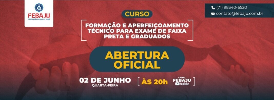 Nesta quarta-feira (2), às 20h, a Federação Baiana de Judô (Febaju) realizará a abertura oficial do Curso de Formação e Aperfeiçoamento Técnico para Exame de Faixa Preta e Graduados – 1º ao 5º Grau – 2021 no canal do YouTube da entidade! 📲💻