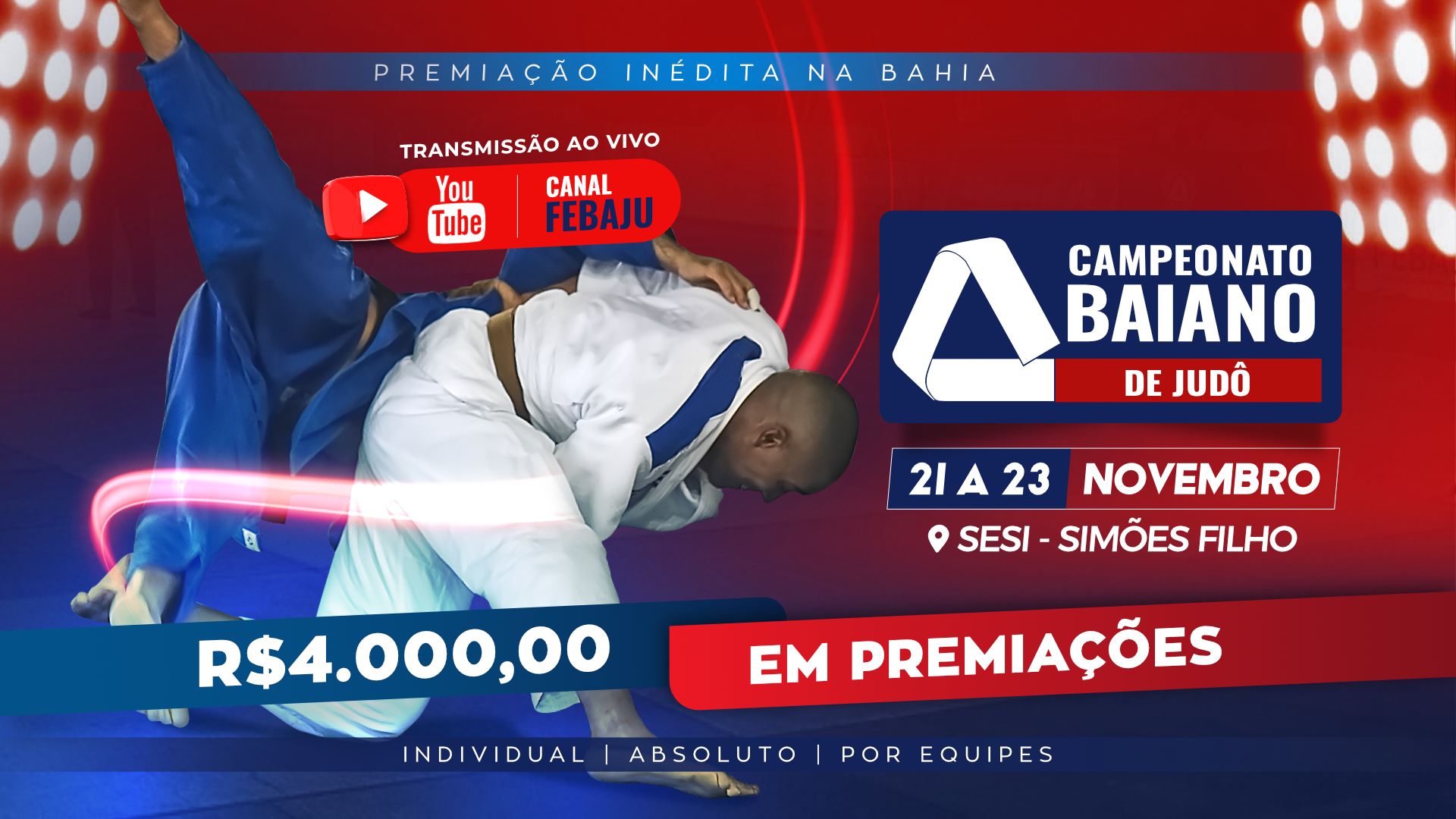 O Campeonato Baiano de Judô reunirá atletas de todo o Estado em mais uma grande celebração da modalidade, marcada por alto nível técnico, espírito esportivo e homenagens especiais nos dias 21 a 23 de Novembro.